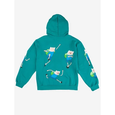 Dive into the whimsical world of Adventure Time with this adult turquoise long sleeve hooded sweatshirt. Adorned with puff prints of Finn in various playful poses on the front, back, and sleeves, this hoodie is a must-have for fans of the series. Made from a comfortable blend of 60% cotton and 40% polyester, it promises durability and warmth. The adjustable hood adds a touch of practicality, making it perfect for any adventure. Easy to care for, just machine wash this sweatshirt on cold with like colors and tumble dry on low heat.