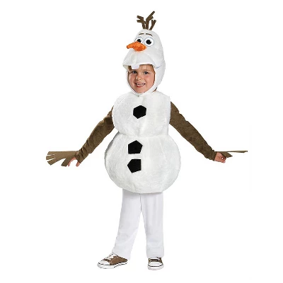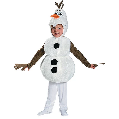 Costume features a white jumpsuit with brown stick-like sleeves, a plush overlay that looks like the body of the snowman and a soft headpiece with a 3D carrot and stitched features. Care Instructions: Hand wash cold water with mild soap. Tumble dry low. For best results hang or lay flat to dry..
