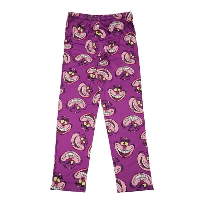 Bring a touch of Wonderland whimsy to your loungewear with these adult purple Disney Alice in Wonderland sleep pajama pants featuring an all-over print of the Cheshire Catâs grinning face. Designed with a drawstring adjustable elastic waistband, side pockets, and soft polyester-spandex brushed jersey, these pants combine playful style with everyday wearability. Machine wash them on cold with like colors and tumble dry on low heat. Use only non-chlorine bleach when needed. Use a cool iron if needed.