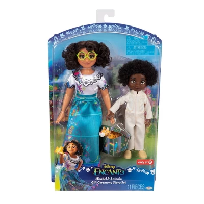 Play out the sweet moment from Disney’s Encanto where Mirabel gifts her cousin Antonio a handmade stuffed jaguar before his magic door ceremony with the Mirabel & Antonio Gift Ceremony Story Set! The closest of cousins, Mirabel and Antonio are a tight duo who share a special bond of friendship. These dolls come wearing their signature outfits and accessories from the film! Mirabelâs dress features a beautiful scalloped collar and sleeves with authentic embroidery-style designs. Look closely at the designs, and youâll find Mirabelâs name printed onto her skirt, just like her dress in Encanto! Her bright green glasses, purple pom-pom earrings, and magenta espadrille shoes complete her classic look. Antonio is dressed in his ceremonial white outfit and shoes, and comes with his jaguar toy and gift box!