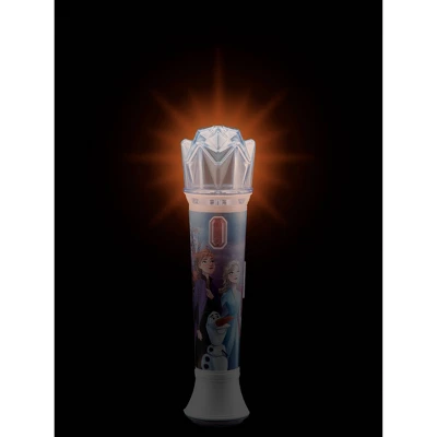 Will You Sing With Me? This super-cool Disney Frozen 2 MP3 microphone features built-in music and flashing lights that create the ultimate concert, right at home! Compatible with any MP3 player (MP3 player not included), this microphone has built-in speakers.Connect your audio device to rock out to your favorite playlist, too! Intended for ages 3 and up.