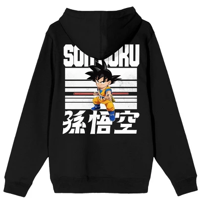 Add dynamic anime style to your wardrobe with this adult black Dragon Ball Daima long sleeve hooded sweatshirt. Featuring the Dragon Ball Daima logo on the front and Goku under bold white âSon Gokuâ text on the back, this hoodie brings iconic character detail to casual wear. The adjustable hood allows for a personalized fit. Crafted from a cotton and polyester blend, it delivers comfort and durability. Machine wash it on cold with like colors and tumble dry on low heat for effortless care.