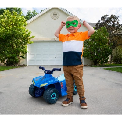 Dawn your pajamas and save the night with the PJ Masks 6 Volt Quad by Dynacraft. Your child gets to join Catboy, Owlette, and Gecko with this rideâs custom PJ Masks graphics. Let them feed their thirst for adventure time and time again with a rechargeable battery, but never fear, the quad tops out at 2 MPH to keep your little superhero safe. Complete with a bold, fun color palette and light-up handlebars, this is the ultimate way to ride in style. Give your child the ultimate adventure mobile with the PJ Masks 6 Volt Quad by Dynacraft.