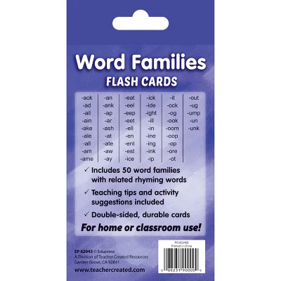 Edupress Word Families Flash Cards | Teach and review word families individually, in groups, or with the whole class! Each flash card set contains a collection of full-color, high-interest student cards as well as instructions and tips for the teacher or parent, suggested activities, and additional blank cards. Each card has a hole in the top corner that can be fit with a ring or string to help with organization and storage. Additionally, each card has one corner that is shaped differently than the others. By lining up the non-rounded corners, the flash cards can quickly be faced in the same direction. When applicable, flash card sets include answers in small print on the reverse side of each card. Each card measures 3-1/8″ x 5-1/8″. Each set includes 56 double-sided cards.