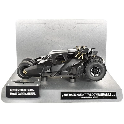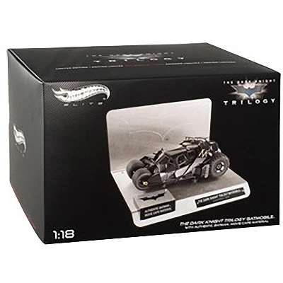 Brand new 1:18 scale diecast model of Elite “The Dark Knight” Trilogy Batmobile With Authentic Movie Batman Cape Material die cast model by Hot Wheels.Brand new box.Real rubber tires.Detailed interior, exterior.Officially licensed product.Made of diecast with some plastic parts.Manufacturer’s original unopened packaging.Dimensions approximately L-10.5, W-4, H-3.5 inches.