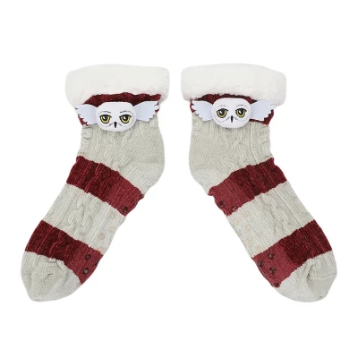 Step into the magical world of Harry Potter with this pair of women’s faux shearling lined quarter crew socks. The socks come in gray with red stripes and feature a 3D Hedwig patch, adding a touch of enchantment to your wardrobe. Made with a blend of 98% polyester and 2% spandex, they offer both comfort and durability. Designed to fit sock size 9-11 and shoe size 5-10, they are easy to maintain. Just machine wash them on cold with like colors and tumble dry on low heat. Do not bleach to keep the designs intact.