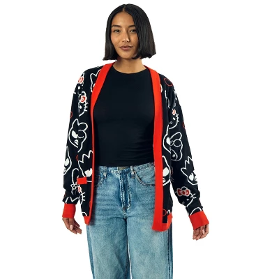 Wrap yourself in cozy comfort with this women’s black Hello Kitty & Friends long sleeve grandma cardigan. Featuring charming outlines of Hello Kitty, My Melody, and Badtz-Maru character heads, this cardigan combines playful style with warmth. The sweater knit blend of 50% rayon, 30% nylon, and 20% polyester ensures softness and durability. Complete with red contrast trim and handy pockets, this cardigan is both functional and fashionable. For easy care, machine wash it on cold with like colors and tumble dry on low heat.