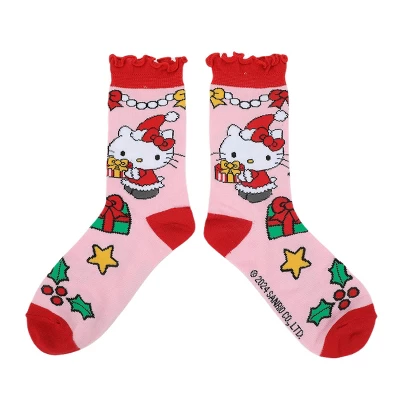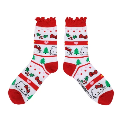 Celebrate the holiday season with this 3-pair pack of women’s Hello Kitty Christmas crew socks. In shades of white, red, and pink, these festive socks feature Hello Kitty surrounded by Christmas presents, trees, and other joyful icons. Made from a blend of 98% polyester and 2% spandex, they offer comfort and durability with stylish lettuce edge cuffs. Designed to fit sock sizes 9-11 and shoe sizes 5-10, they’re easy to care for. Just machine wash on cold with like colors and tumble dry on low heat. Avoid bleach to keep them looking vibrant.