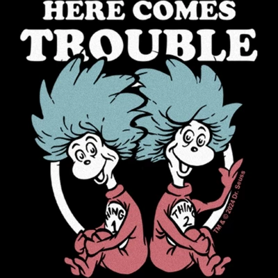 - The smallest family members are also the most stylish with this new Bodysuit that is perfect for crawling around and indoor play! Featuring Thing One and Thing Two sitting together along with the phrase: “Here Comes Trouble” printed in white lettering across the top.