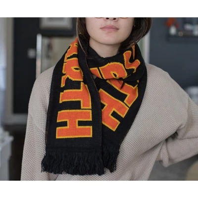 - ✔️ STYLISH AND LONG: Our knitted 5ft scarf looks great on anyone! Scarf is black with red text.