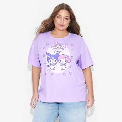 - Womenâs T-shirt featuring ‘my melody and kuromi’ graphic