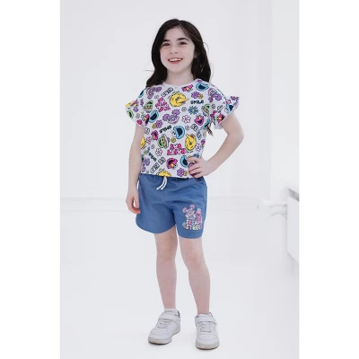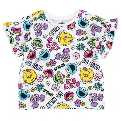 Dress your little one in this adorable Sesame Street outfit and watch them learn and play with their favorite characters! This fashionable short sleeve tee and chambray shorts set features cute flutter sleeves, pretty glitter detailing, and colorful artwork of Elmo, Cookie Monster, Big Bird, Oscar the Grouch, and Abby Cadabby with fun inspirational quotes and flowers that your little girl will love to wear! Soft and stylish, this comfortable Sesame Street clothing set is made for all day adventure!
