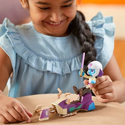 Speed off into adventure with the Star Wars Lys Solay Figure & Speeder Bike! This preschool toy for boys and girls includes a speeder bike, Lightsaber accessory, and a Lys Solay small action figure — a beloved character from the Disney+ animated series, Young Jedi Adventures. This 3-inch-tall Star Wars figure features a molded-on helmet and multiple points of articulation for fun, poseable play. Lys fits right into her included speeder bike, and her hands can even attach to the handles. The speeder bike features wheels on the bottom, so Lys is ready to roll right out of the package. Mini action figures, plush toys, and vehicles from Hasbro’s Young Jedi Adventures collection make the perfect Star Wars gift for preschoolers! (Additional products each sold separately. Subject to availability.)