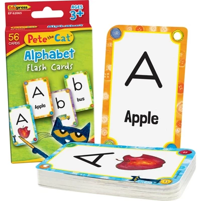 Teacher Created Resources Pete the Cat Alphabet Flash Cards | Learning foundational alphabet skills is groovy with Pete the Cat. This flash card set contains a collection of full-color, high-interest student cards as well as instructions and tips for the teacher or parent, suggested activities, and additional blank cards. Each card has a hole in the top corner that can be fit with a ring or string to help with organization and storage. Additionally, each card has one corner that is shaped differently than the others. By lining up the non-rounded corners, the flash cards can quickly be face in the same direction. Each card is 3-1/8″ x 5-1/8″. 56 Double-sided cards.