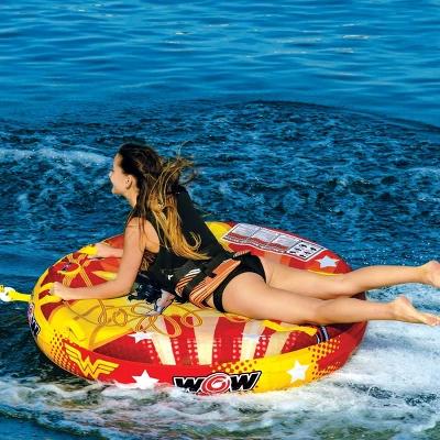 Isn’t Wonder Woman just iconic? This towable was designed to last summer after summer, with a vibrant HI-VIS image of Wonder Woman that won’t chip or rub off. This is a two-person towable, perfect for you and a friend to hop on for an exhilarating ride with Wonder Woman by your side , or to get some hang time in the sun with this beloved character. The full nylon zippered cover keeps your towable looking great when not in use. And the built-in molded EZ Tow Connector makes connecting it to your boat a cinch. The tapered shape (high in the front, low in the back) makes acceleration comfortable once the boat gets going, too.